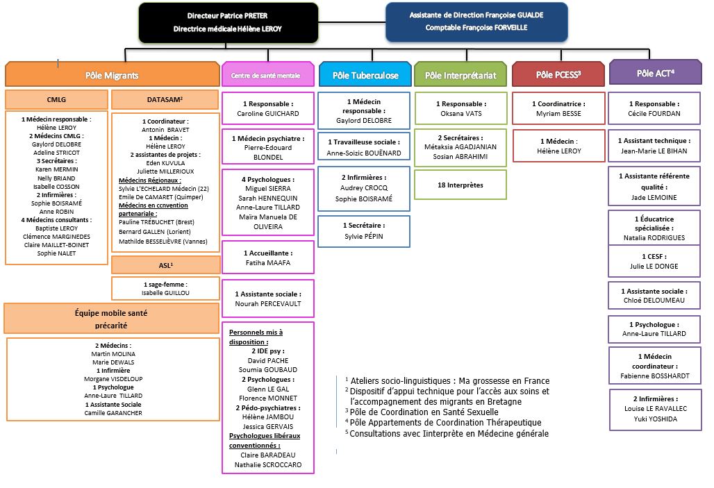 - 68 salariés pour 46 ETP : médecins, infirmières, psychologues, travailleurs sociaux, coordinateurs de projets, personnel administratifs, interprètes et équipe de direction